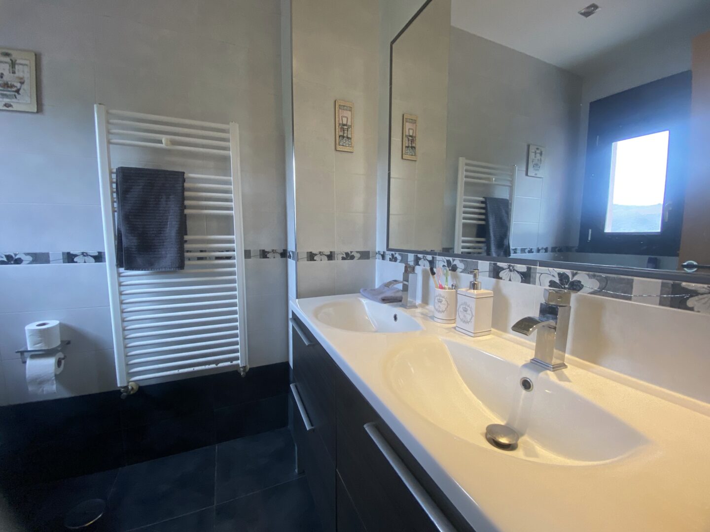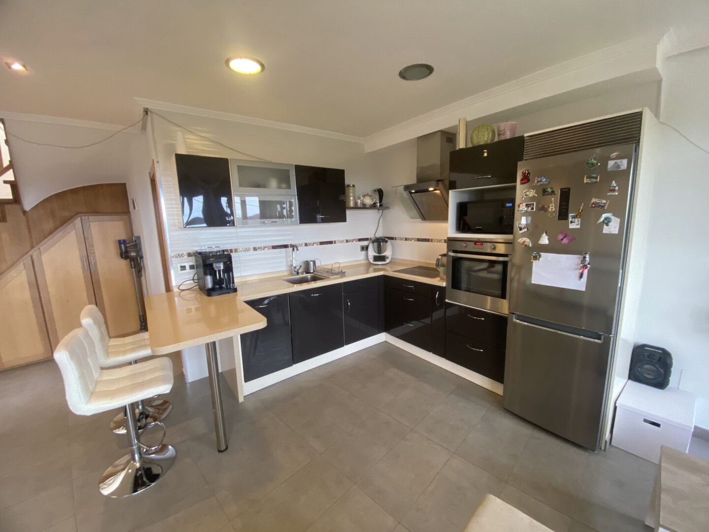 A través de una puerta interior desde el garaje o por la puerta principal accedemos al recibidor, donde encontramos las escaleras para subir a la primera planta, que está distribuida en un amplio y luminoso salón-comedor-cocina, balcones con varandillas de acero inoxidable con gran ventanal desde el que no se cansará de disfrutar de las amplias y preciosas vistas al mar y a la montaña, además cuenta con un aseo o servicio en planta.
