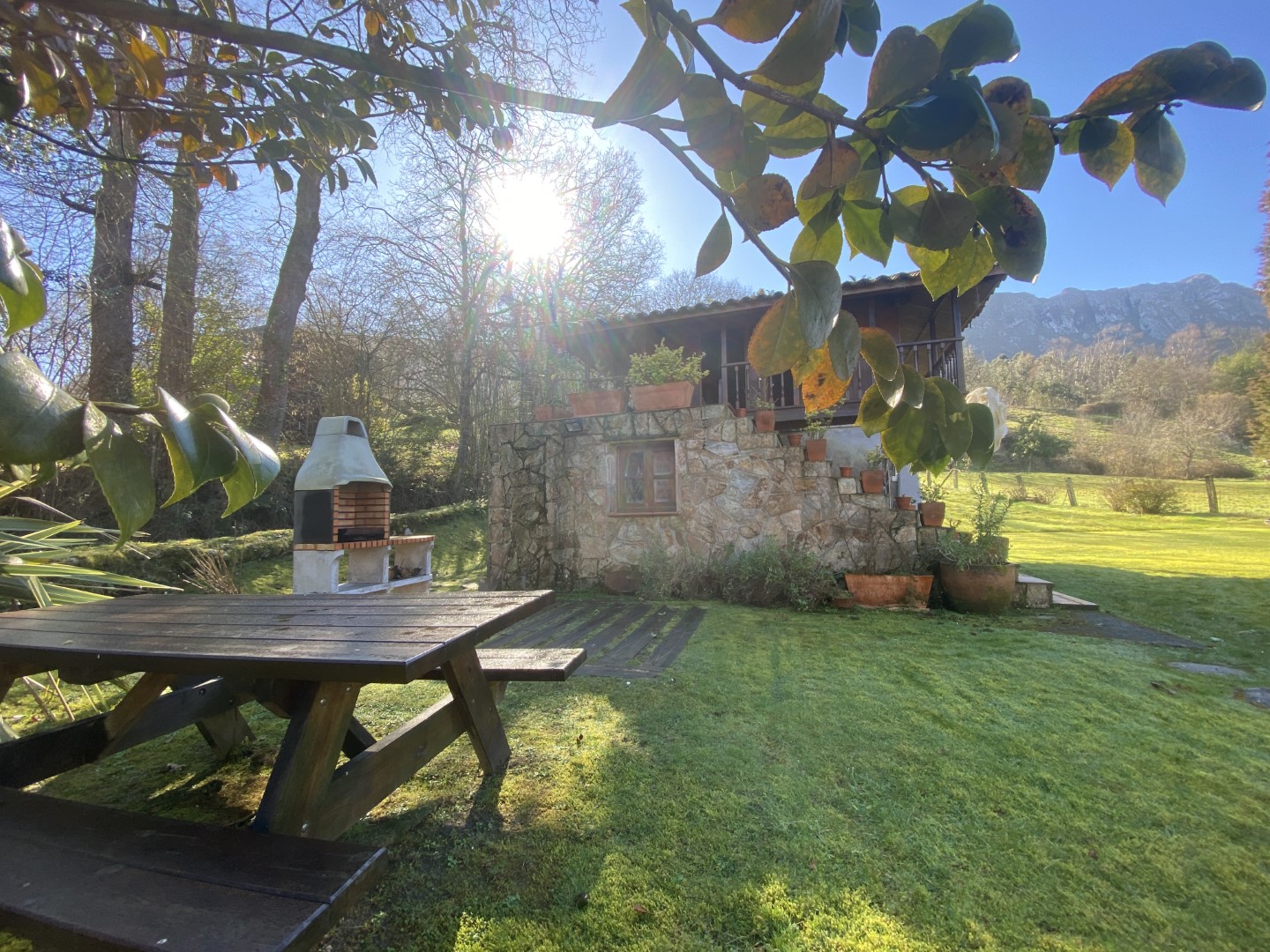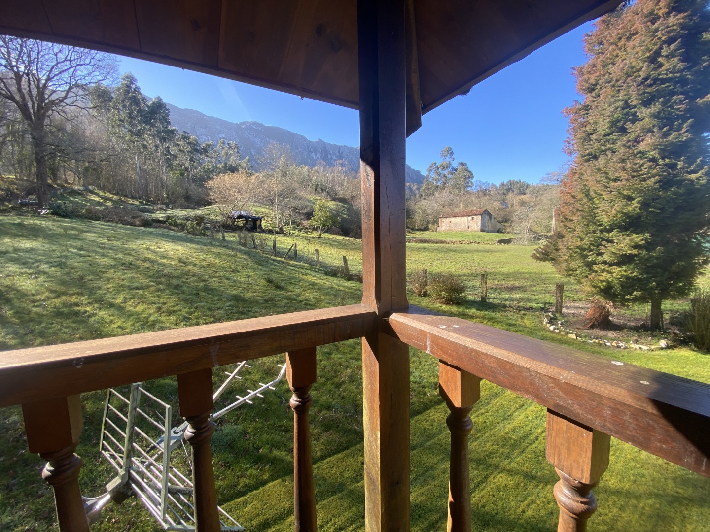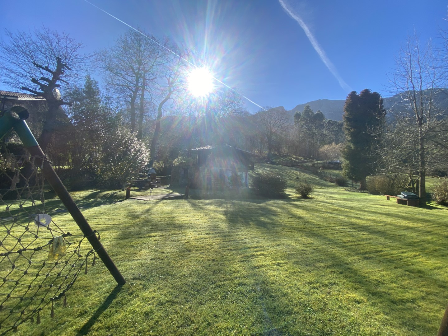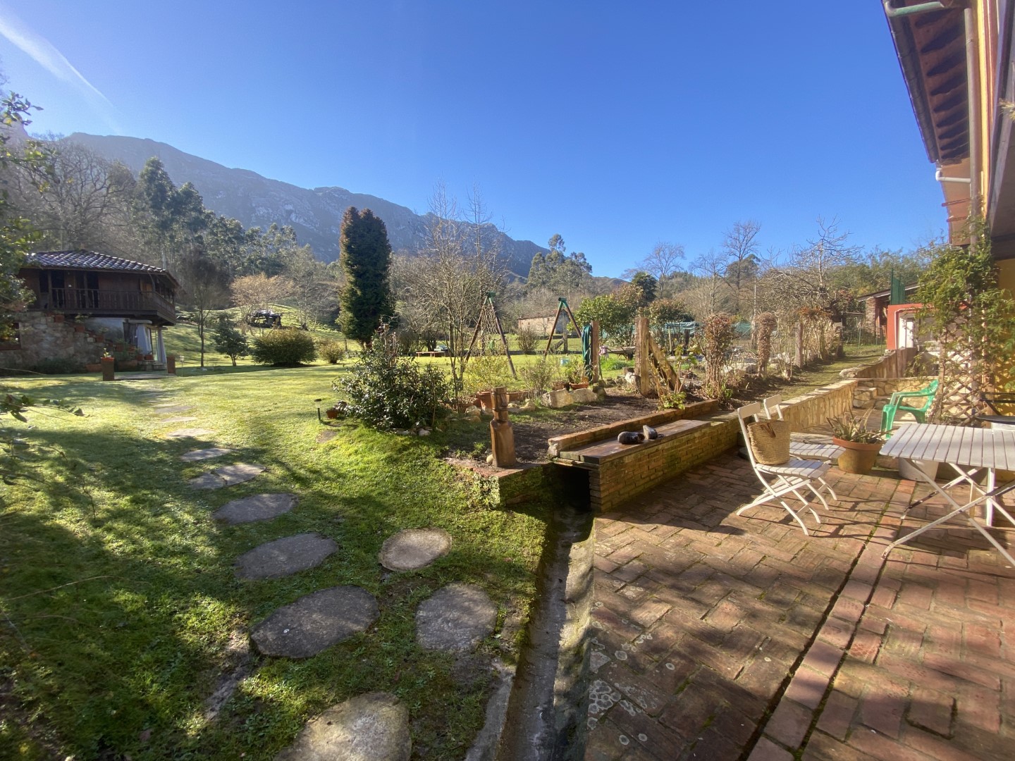 La casa es adosada por un lado, con un pequeño riego por el otro, con un gran jardín de más de 2000 metros cuadrados donde está el ‘horreo’, árboles alrededor con vistas a la montaña al fondo.