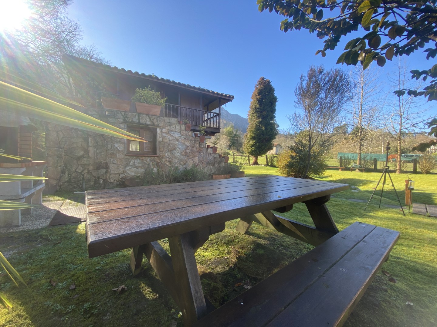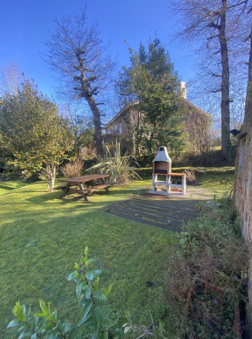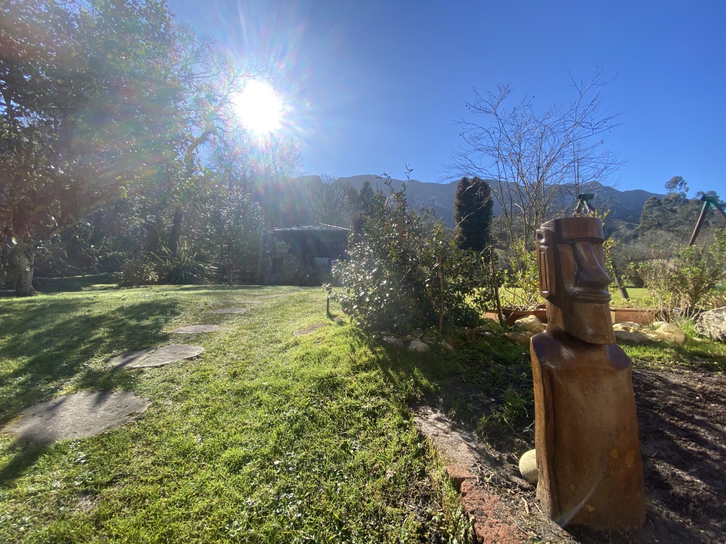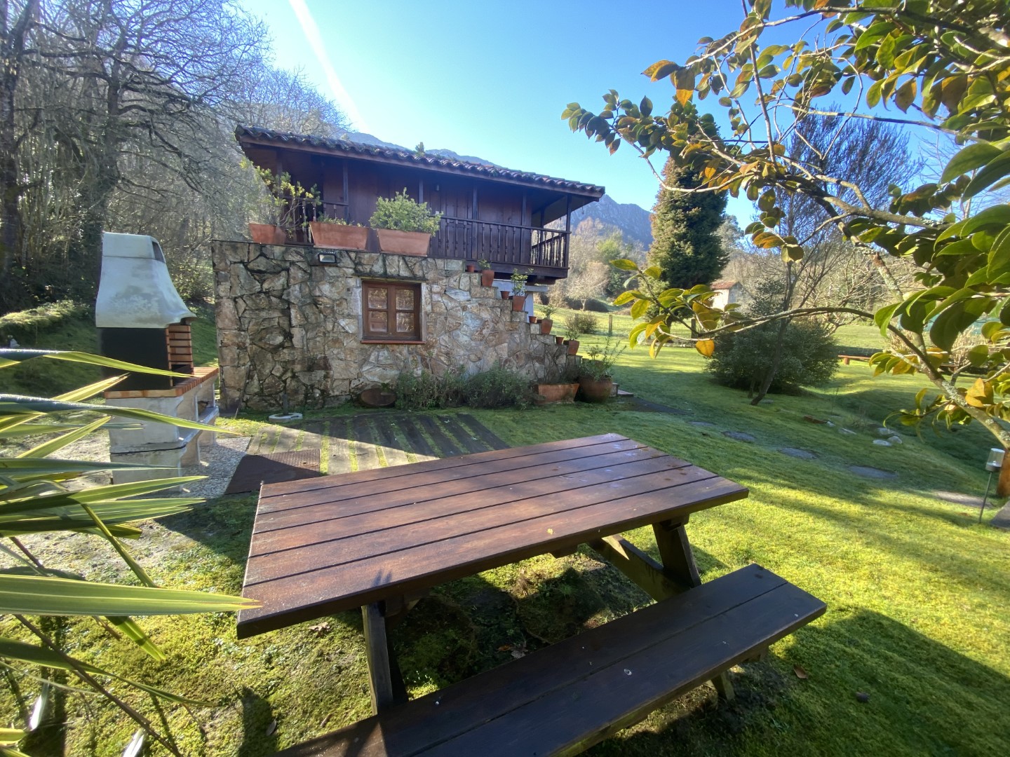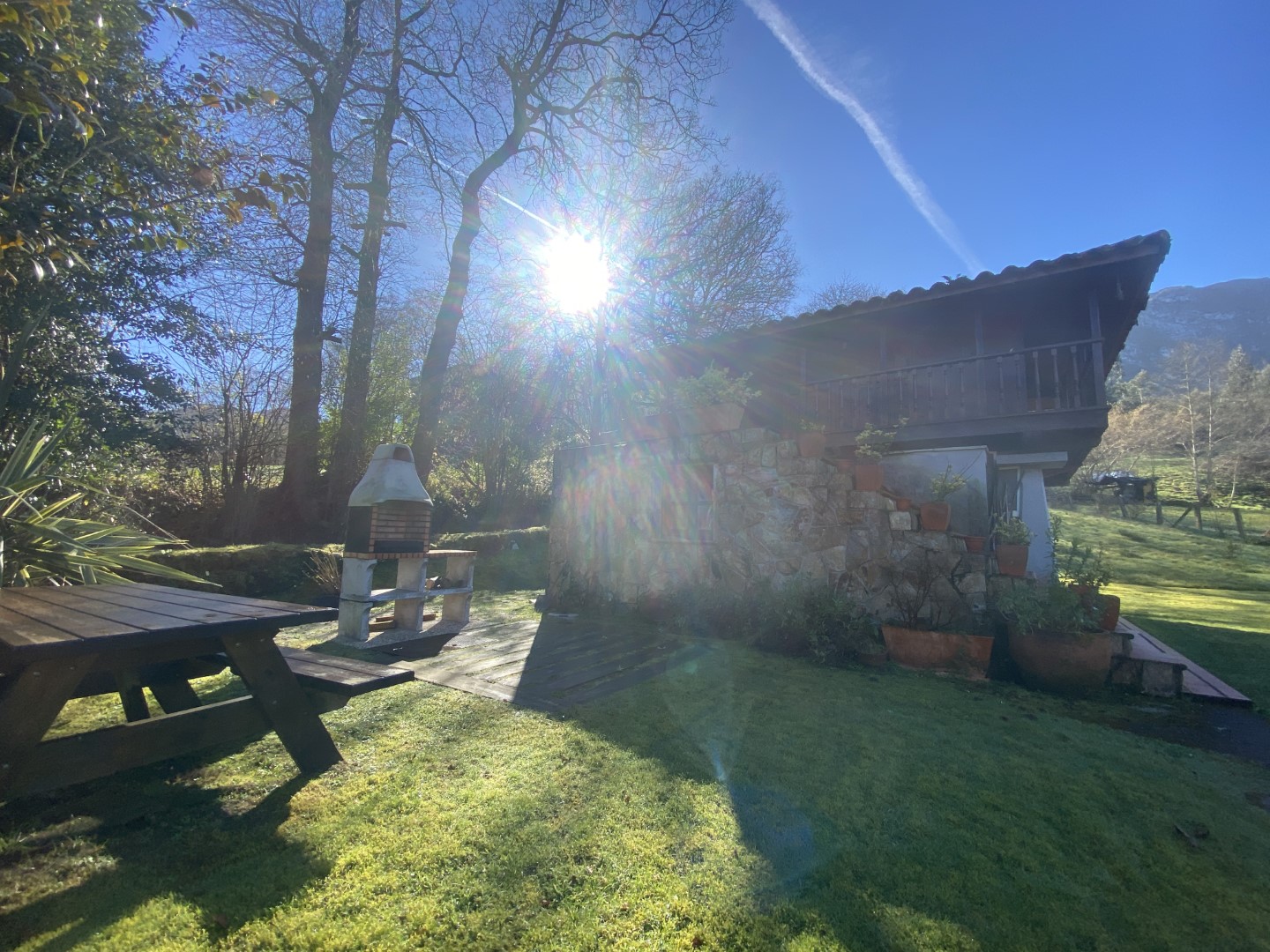 La casa es adosada por un lado, con un pequeño riego por el otro, con un gran jardín de más de 2000 metros cuadrados donde está el ‘horreo’, árboles alrededor con vistas a la montaña al fondo.