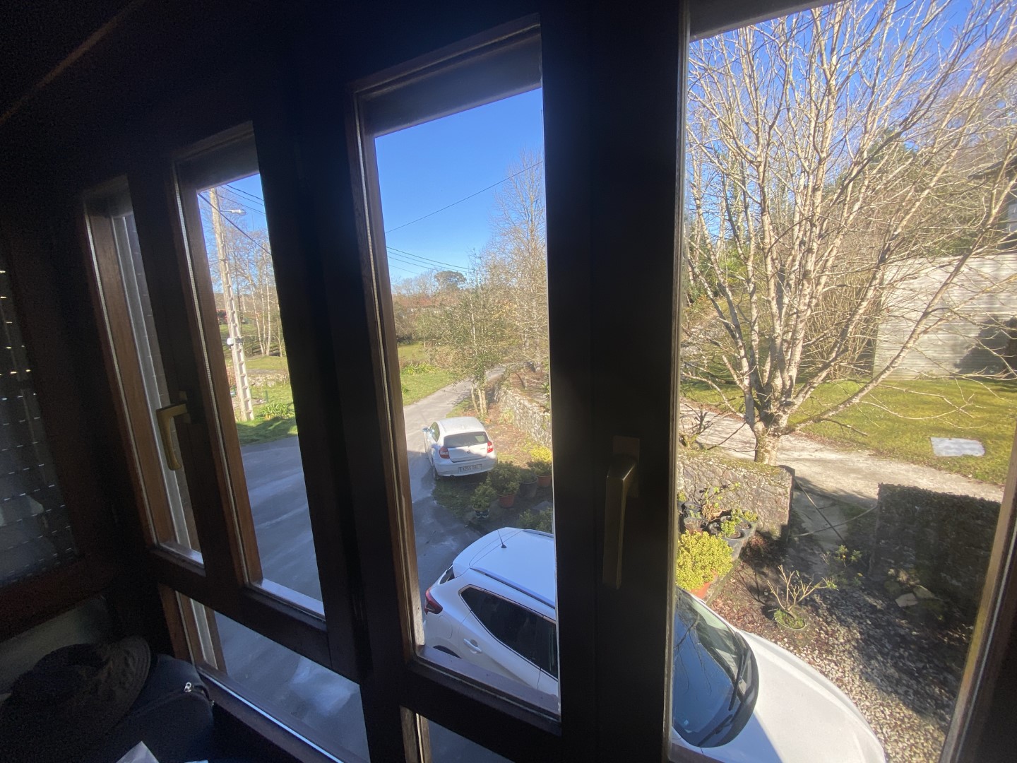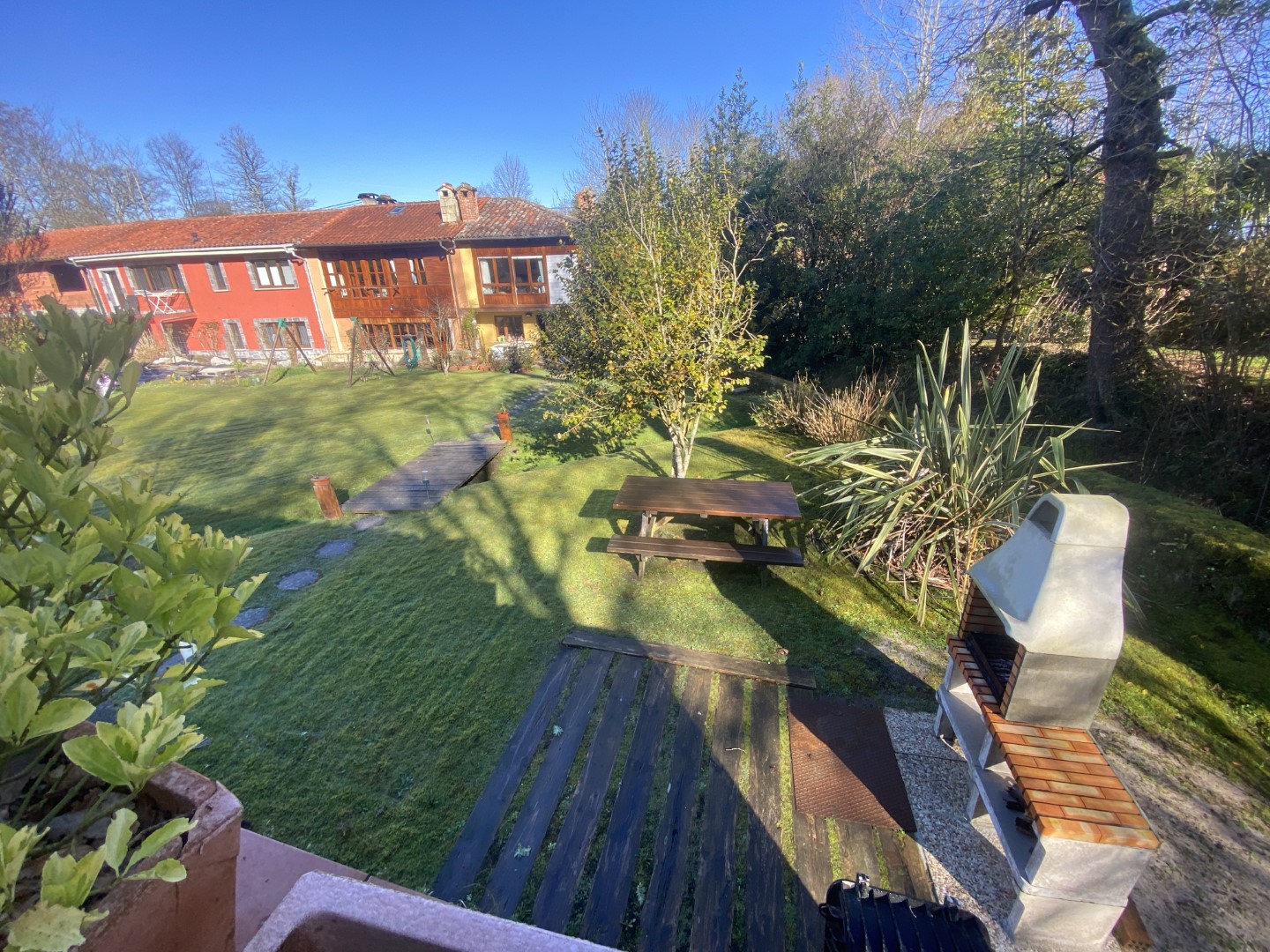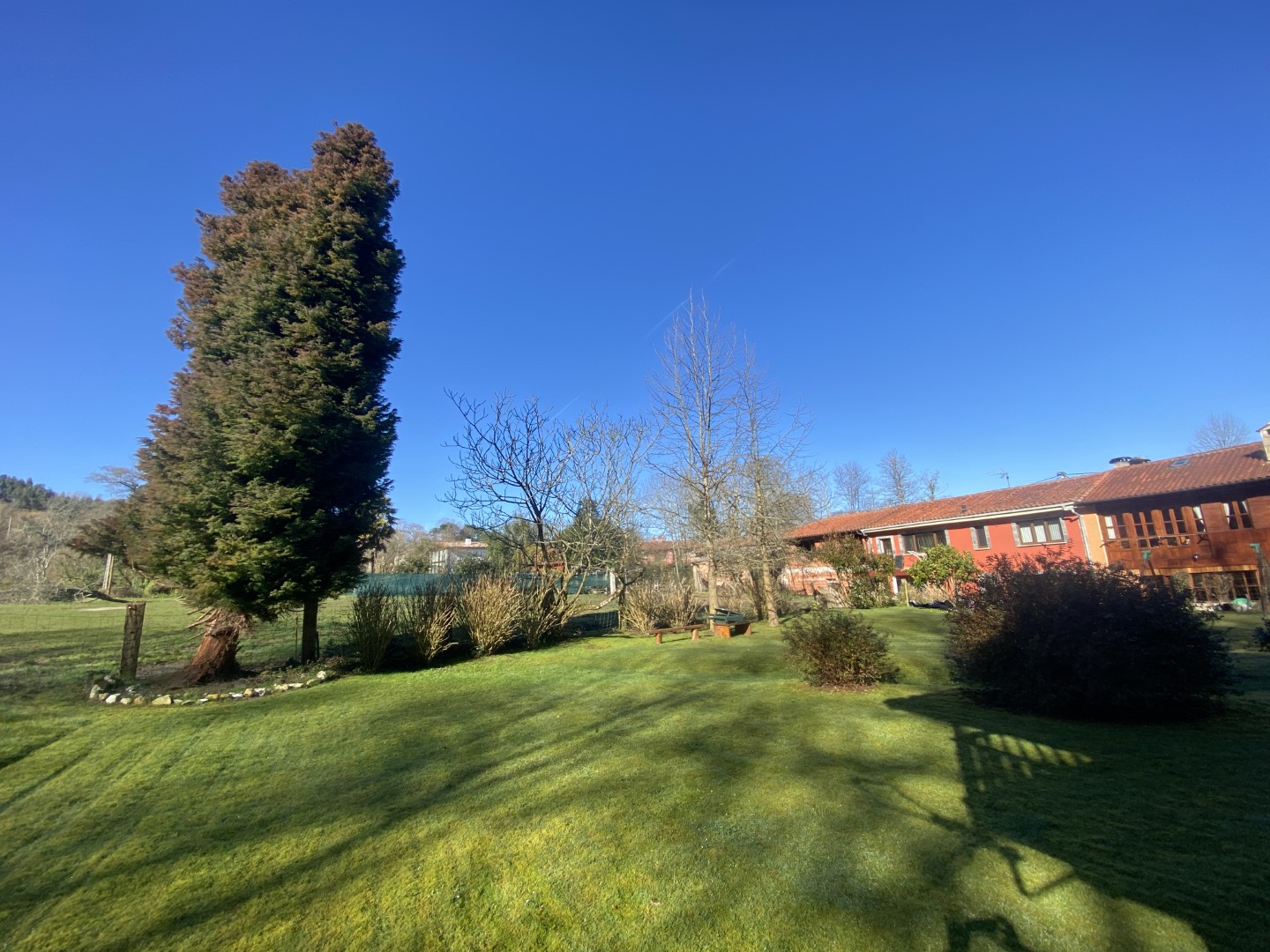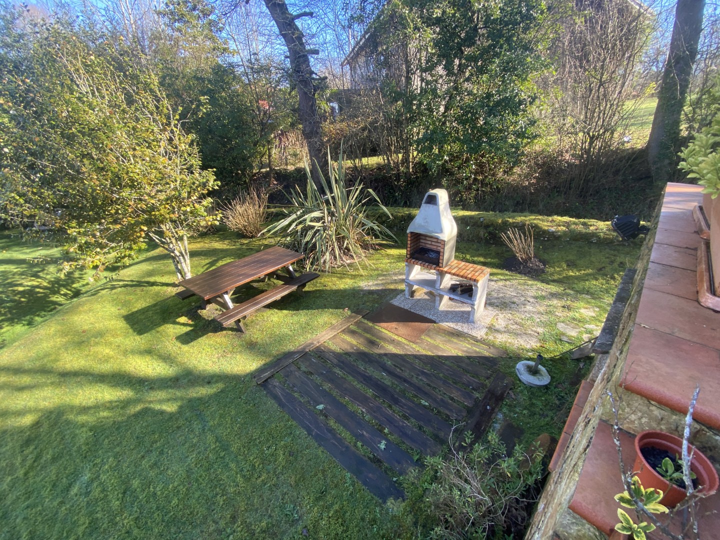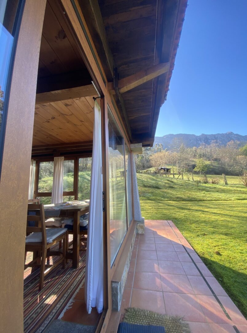 La casa es adosada por un lado, con un pequeño riego por el otro, con un gran jardín de más de 2000 metros cuadrados donde está el ‘horreo’, árboles alrededor con vistas a la montaña al fondo.