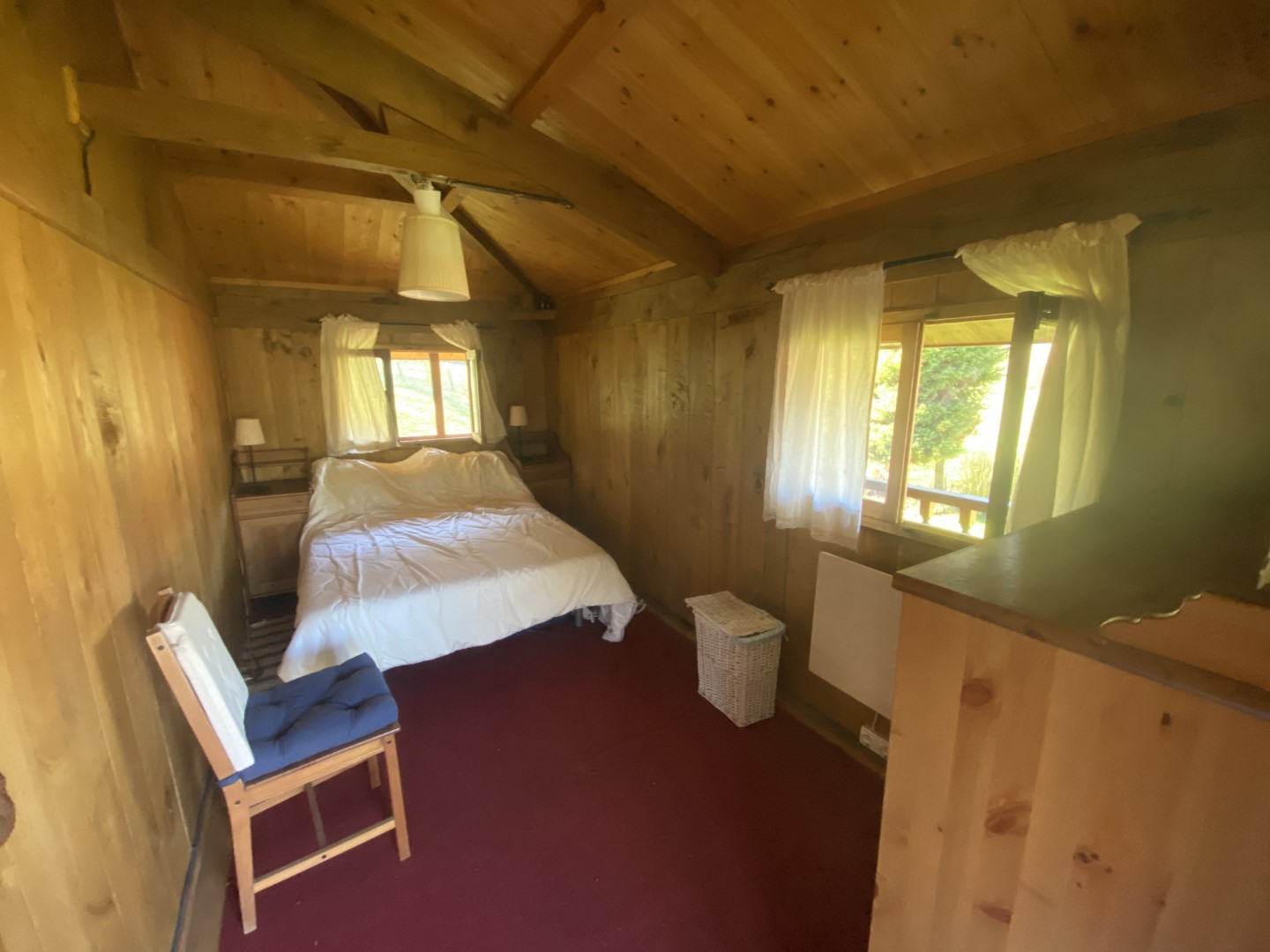 Arriba: 1 dormitorio, una sala de estar con chimenea y baño.