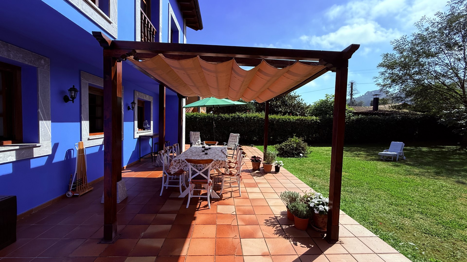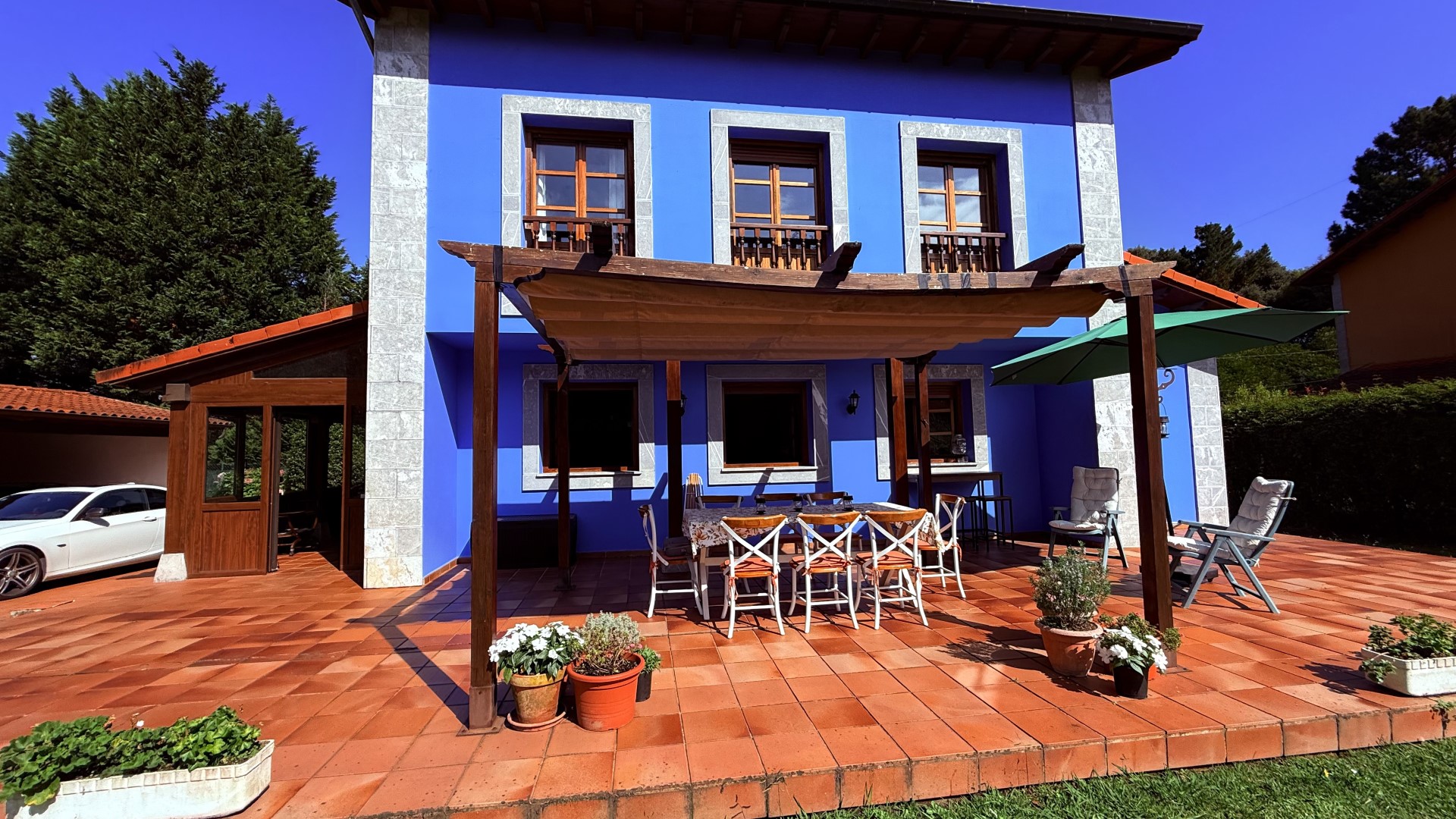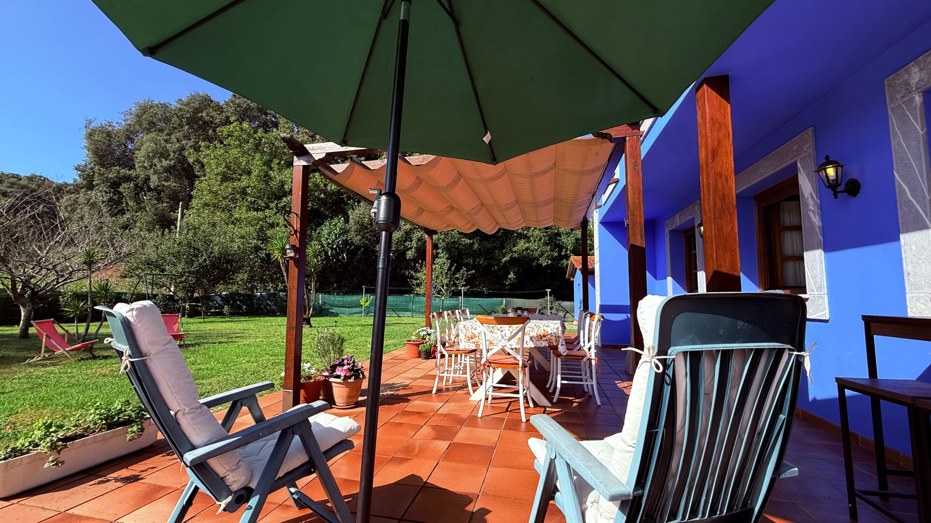 Bajas a la cocina, donde el aroma a café recién hecho llena el aire. El salón se inunda de sol desde temprano y, al abrir la puerta del porche, una brisa suave te saluda. Tu día puede empezar con un desayuno al aire libre, bajo la pérgola, con las primeras risas de los niños jugando en su pequeña casa azul al fondo del jardín.