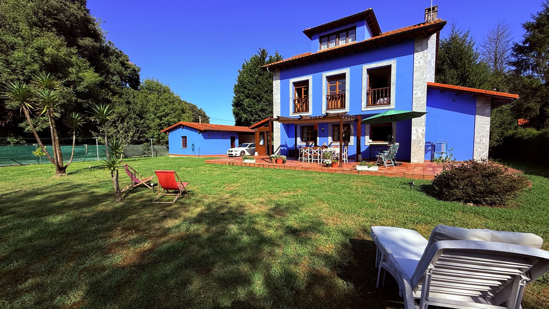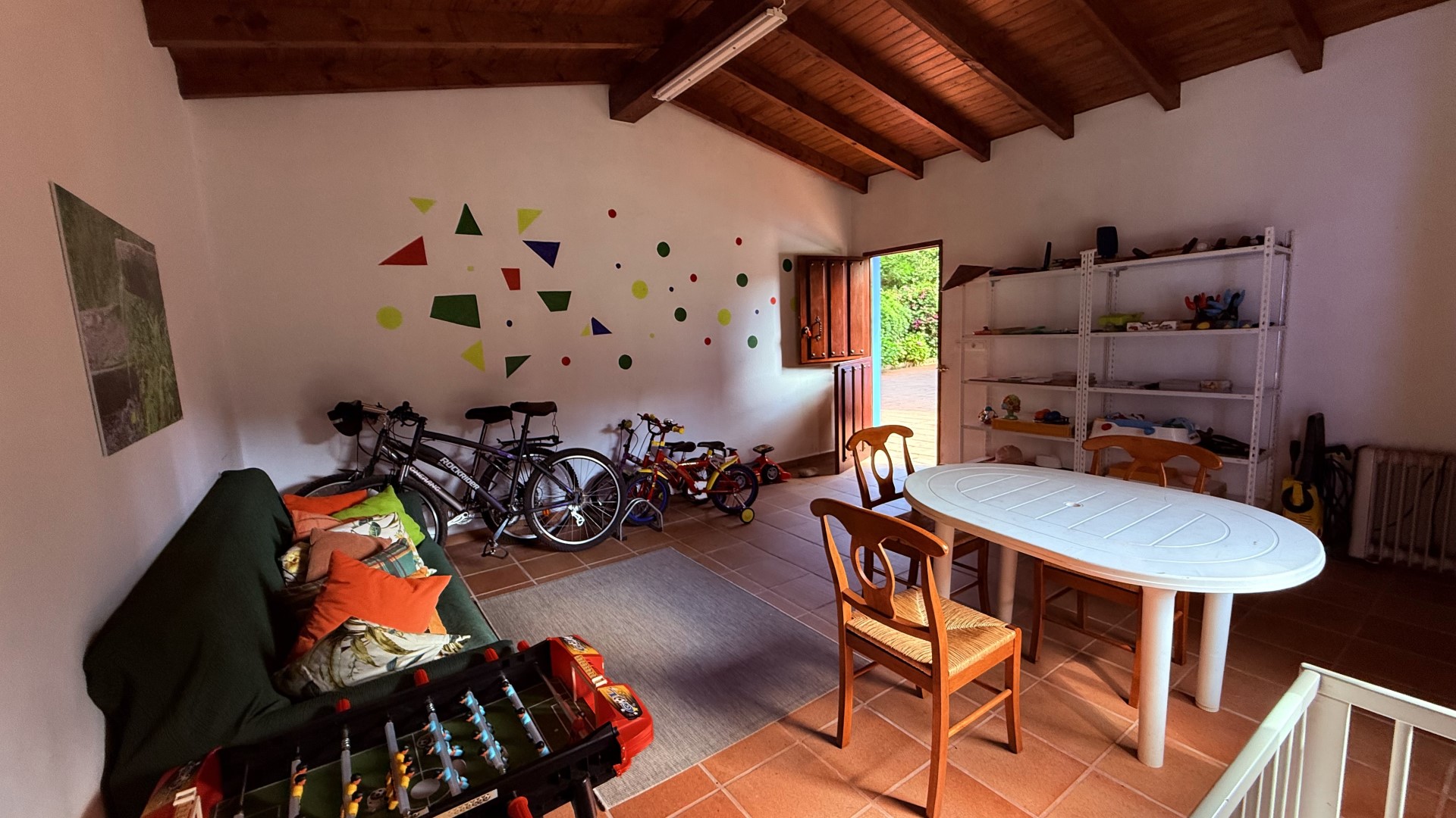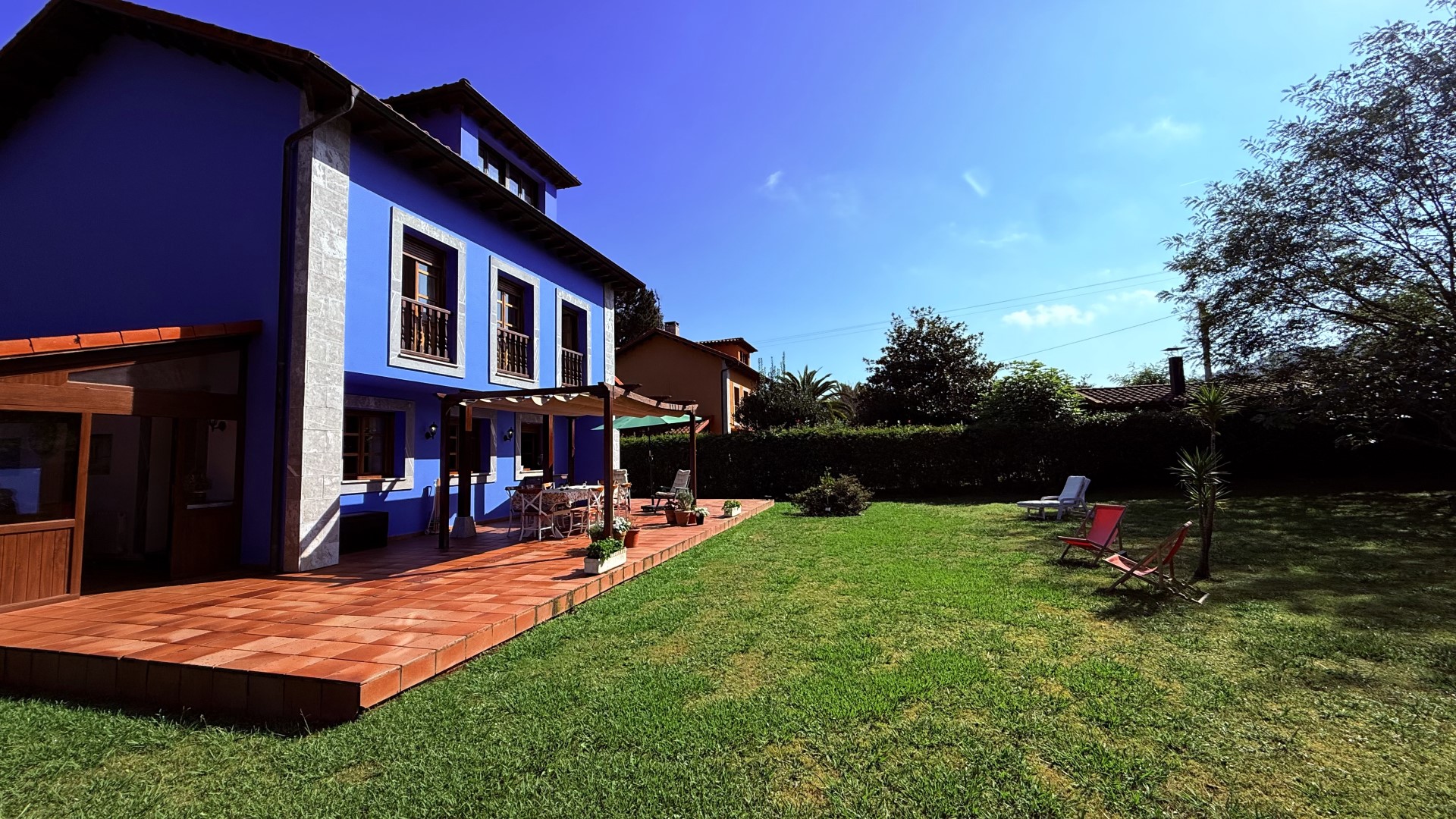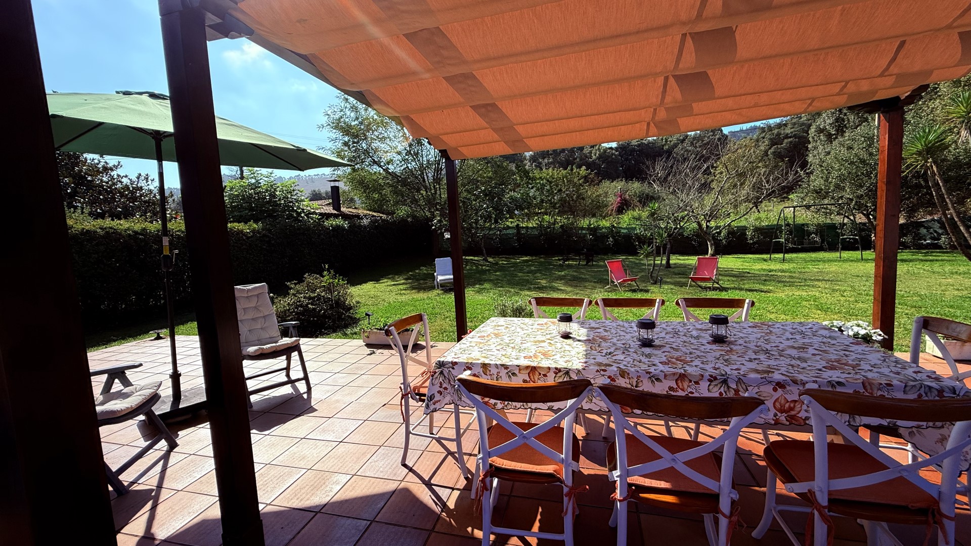 Bajas a la cocina, donde el aroma a café recién hecho llena el aire. El salón se inunda de sol desde temprano y, al abrir la puerta del porche, una brisa suave te saluda. Tu día puede empezar con un desayuno al aire libre, bajo la pérgola, con las primeras risas de los niños jugando en su pequeña casa azul al fondo del jardín.