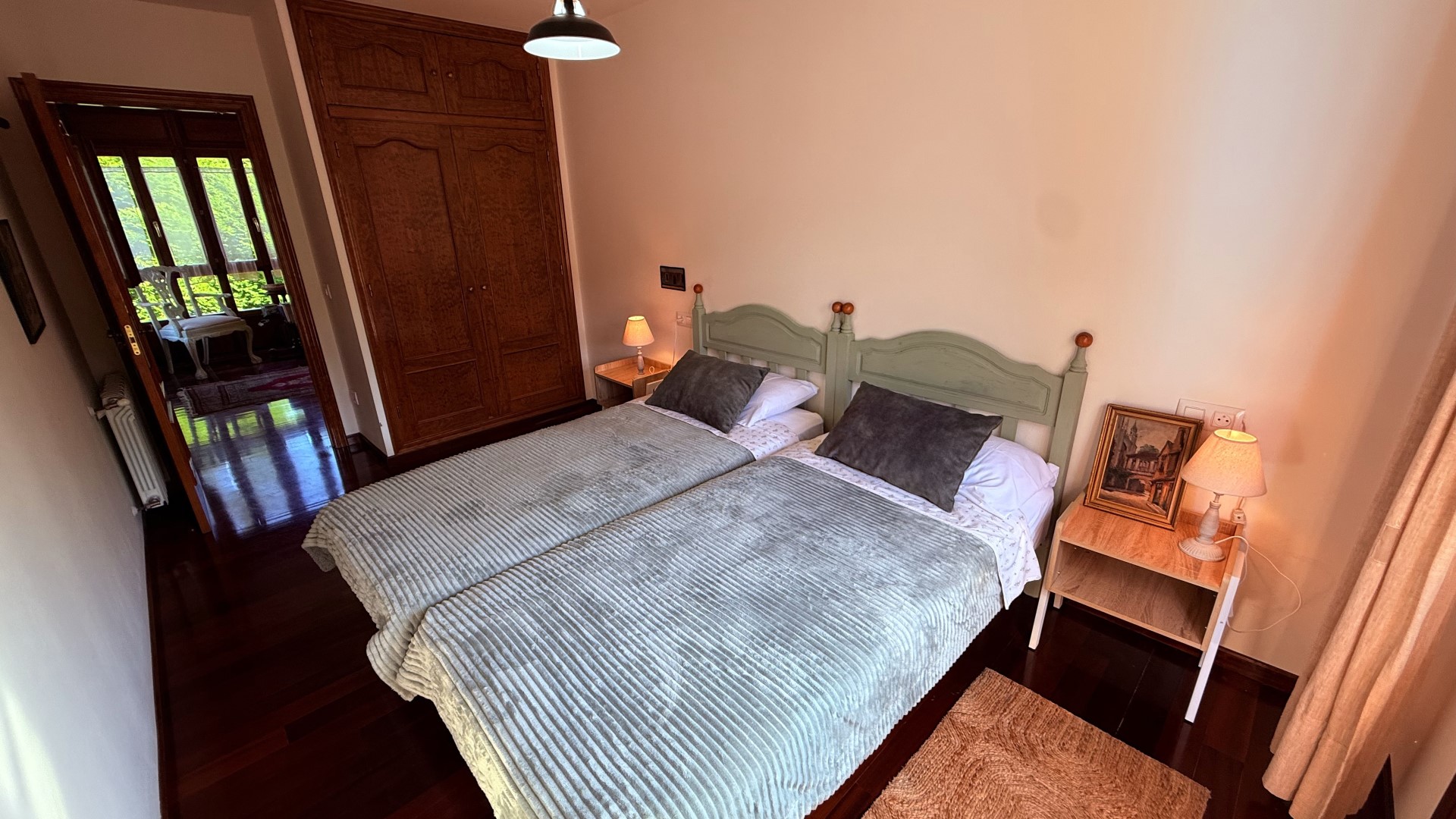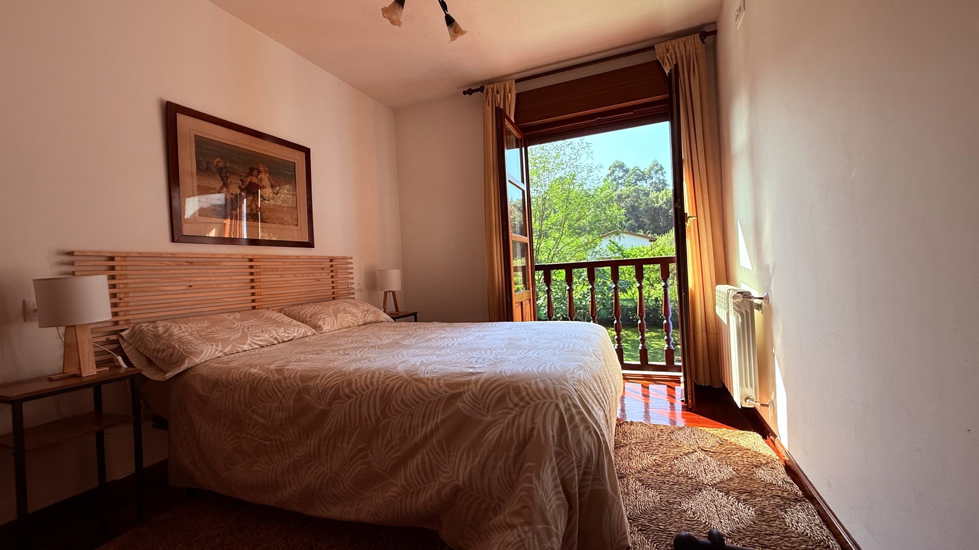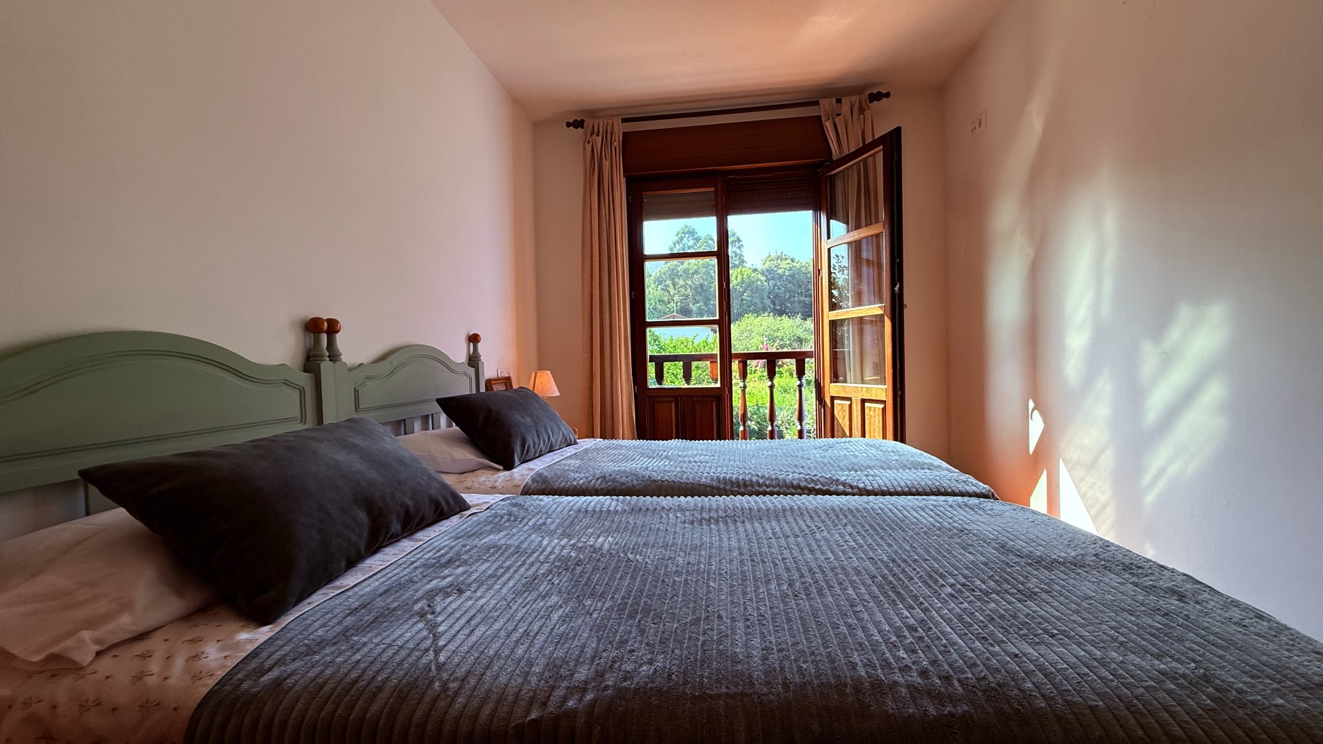 Despiertas con la luz dorada filtrándose por las grandes ventanas de madera. Desde la cama escuchas el suave canto del gallo y, a lo lejos, el tren que cruza tranquilo el paisaje asturiano. Abres las contraventanas y te asomas: el jardín está cubierto por un leve rocío, las montañas al fondo y la calma que solo un entorno como este puede ofrecer.